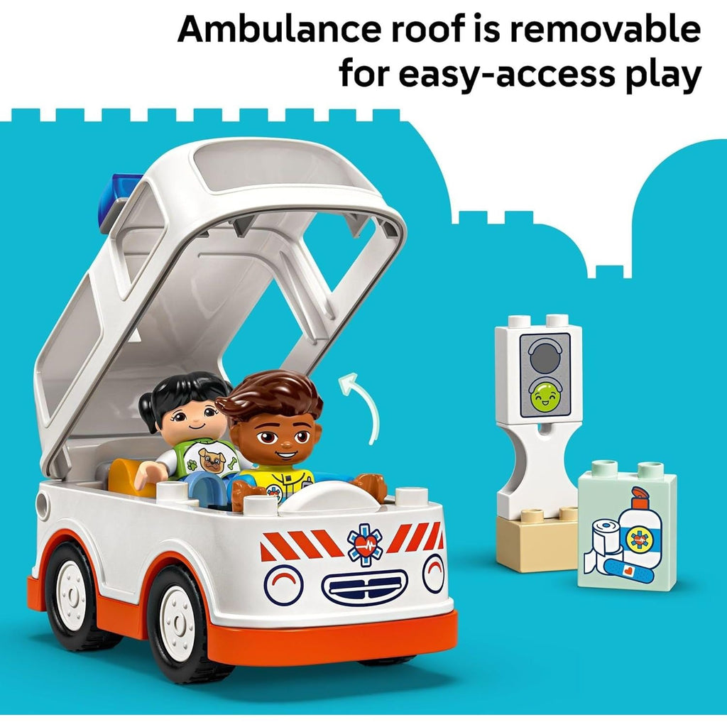 Caring toddlers pretend play exciting rescue scenes with the Ambulance & Driver (10447) toy for preschool kids. This toddler toy also includes a drivable ambulance toy and 2 LEGO® DUPLO® figures, a paramedic and girl, for creative imaginary play.