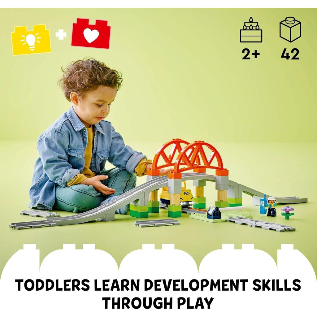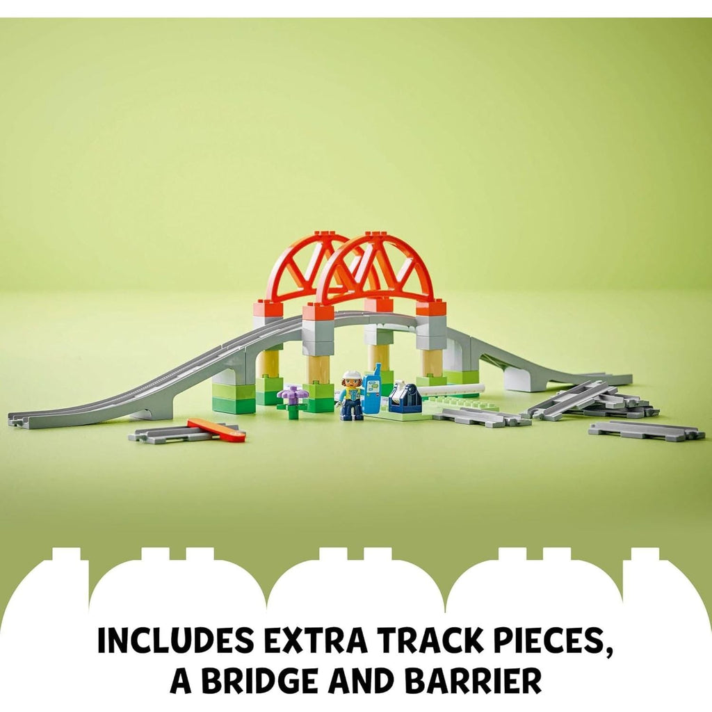 - Train track toy set – Toddlers aged 2+ extend their LEGO® DUPLO® railway adventures and learn development skills with the Train Bridge and Tracks Expansion Set