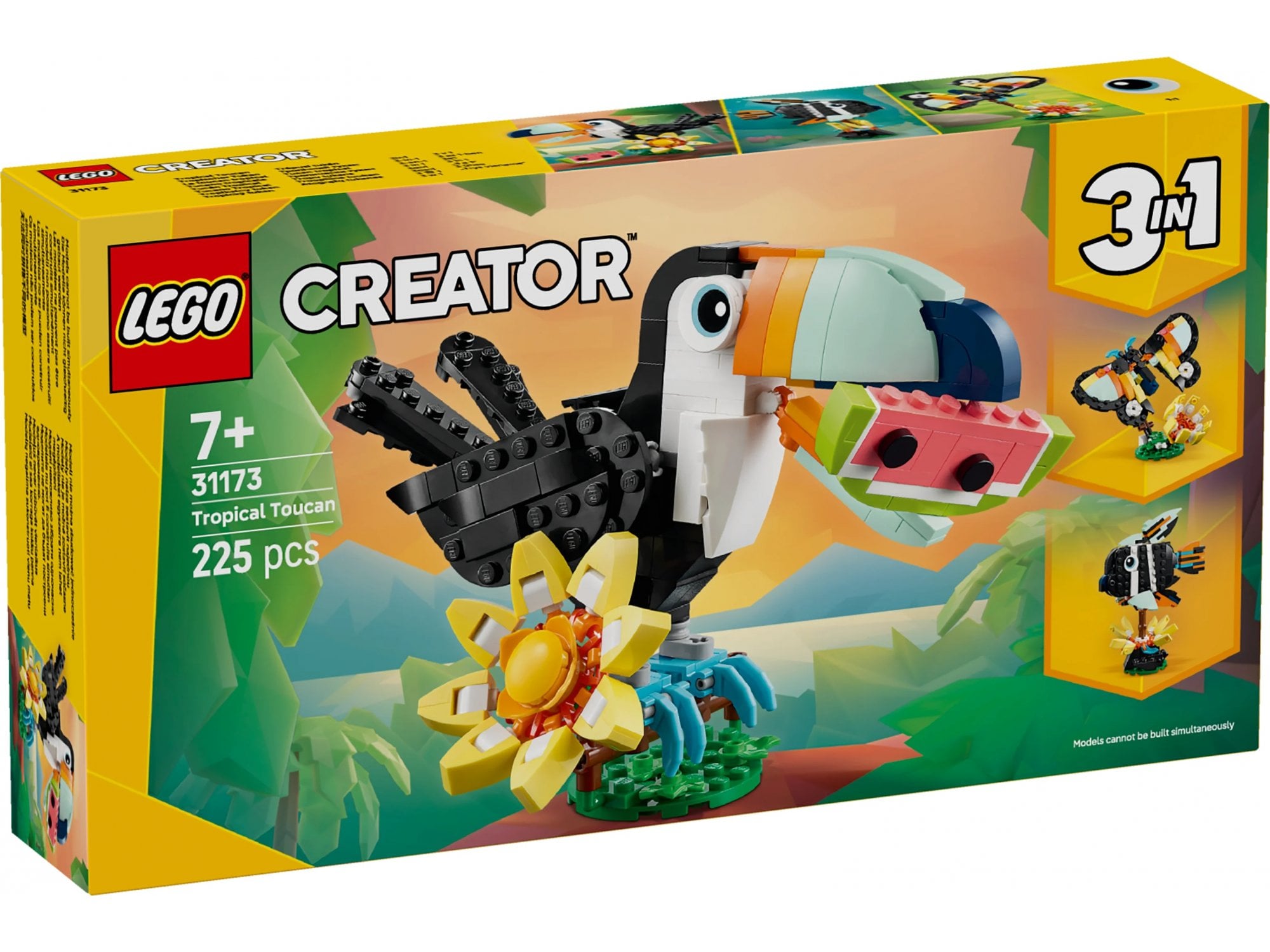 Enjoy tropical fun with this beautiful LEGO® Creator 3in1 Wild Animals: Tropical Toucan (31173) building set. The LEGO toy bird sits on a branch covered with a large brick-built flower and a slice of watermelon, and for added play value it can move its wings, beak and tail feathers.