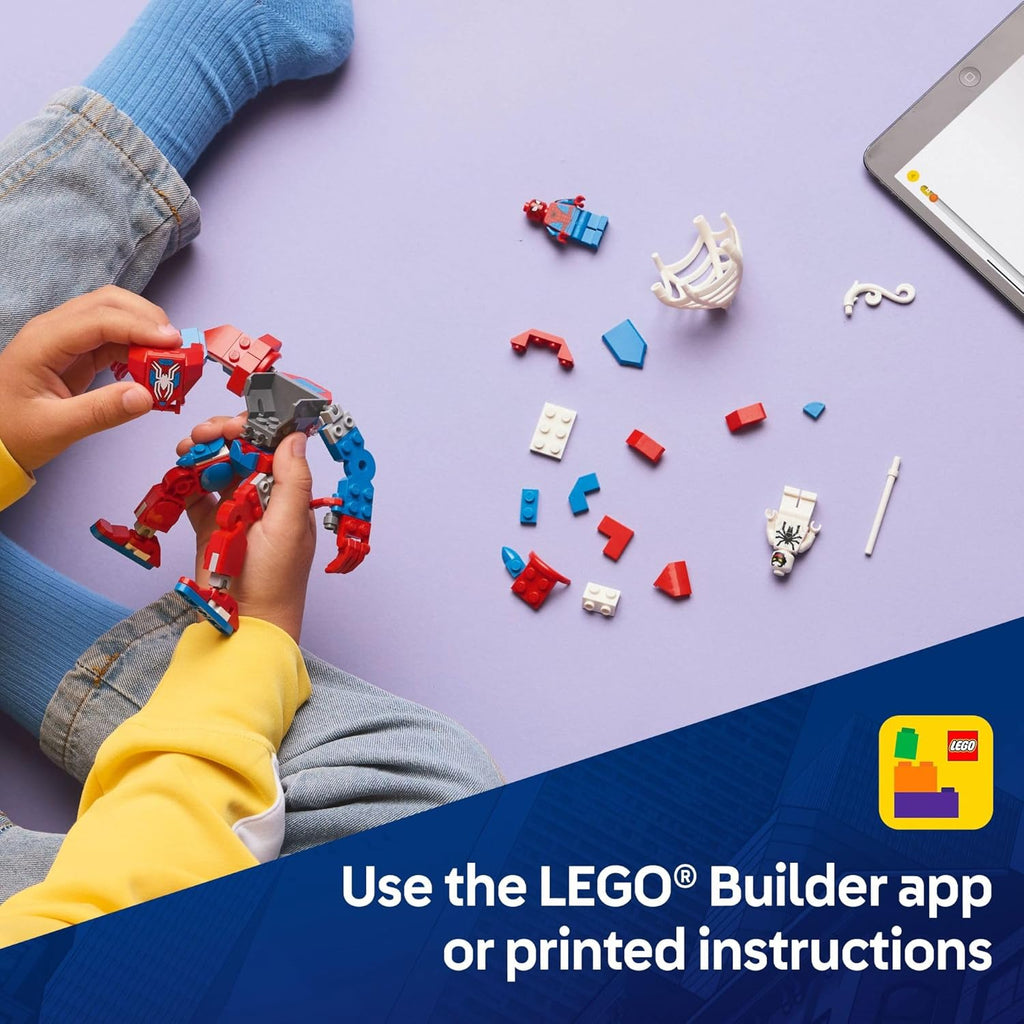 - Spider-Man Mech buildable figure – The LEGO® Marvel mech has movable arms, legs and fingers, and the torso opens to reveal a cockpit that can hold the Spider-Man minifigure