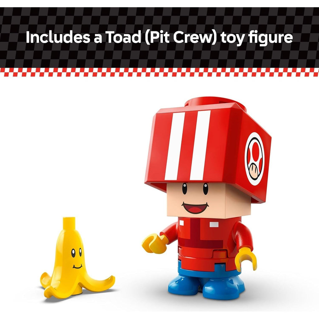 - Toad (Pit Crew) toy figure – This LEGO® brick-built Mario Kart™adventure playset features a Toad (Pit Crew) figure in red pit crew uniform, plus a Banana element with face decoration