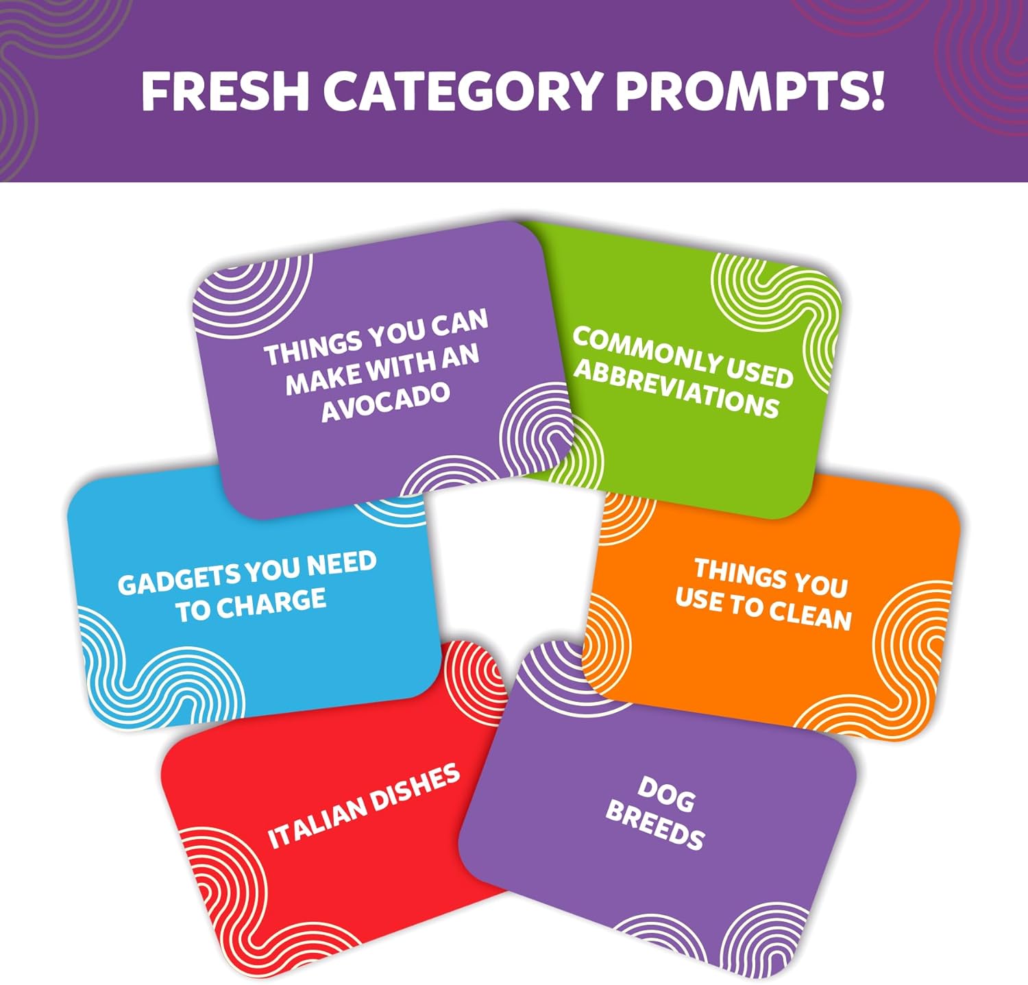INCLUDES: 200 Category Cards, 30 Letter Cards, 8 Pens, 1 Notepad, and an Instruction Manual.