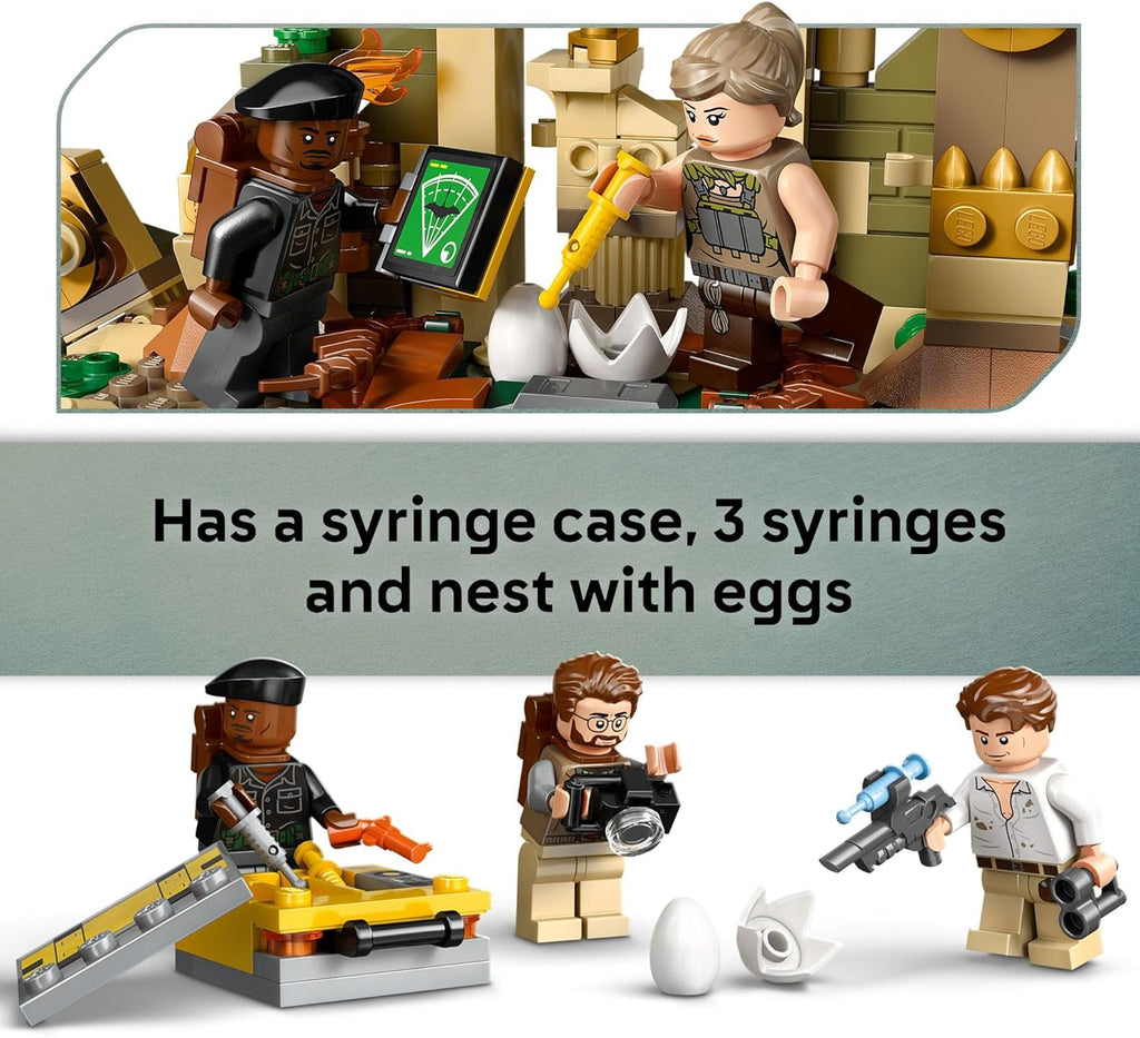 • Jurassic World Rebirth toys in a LEGO® box – Molded Spinosaurus and Quetzalcoatlus figures, 4 movie character minifigures, an ancient temple, a toy helicopter and dinosaur truck toy, plus lots of details