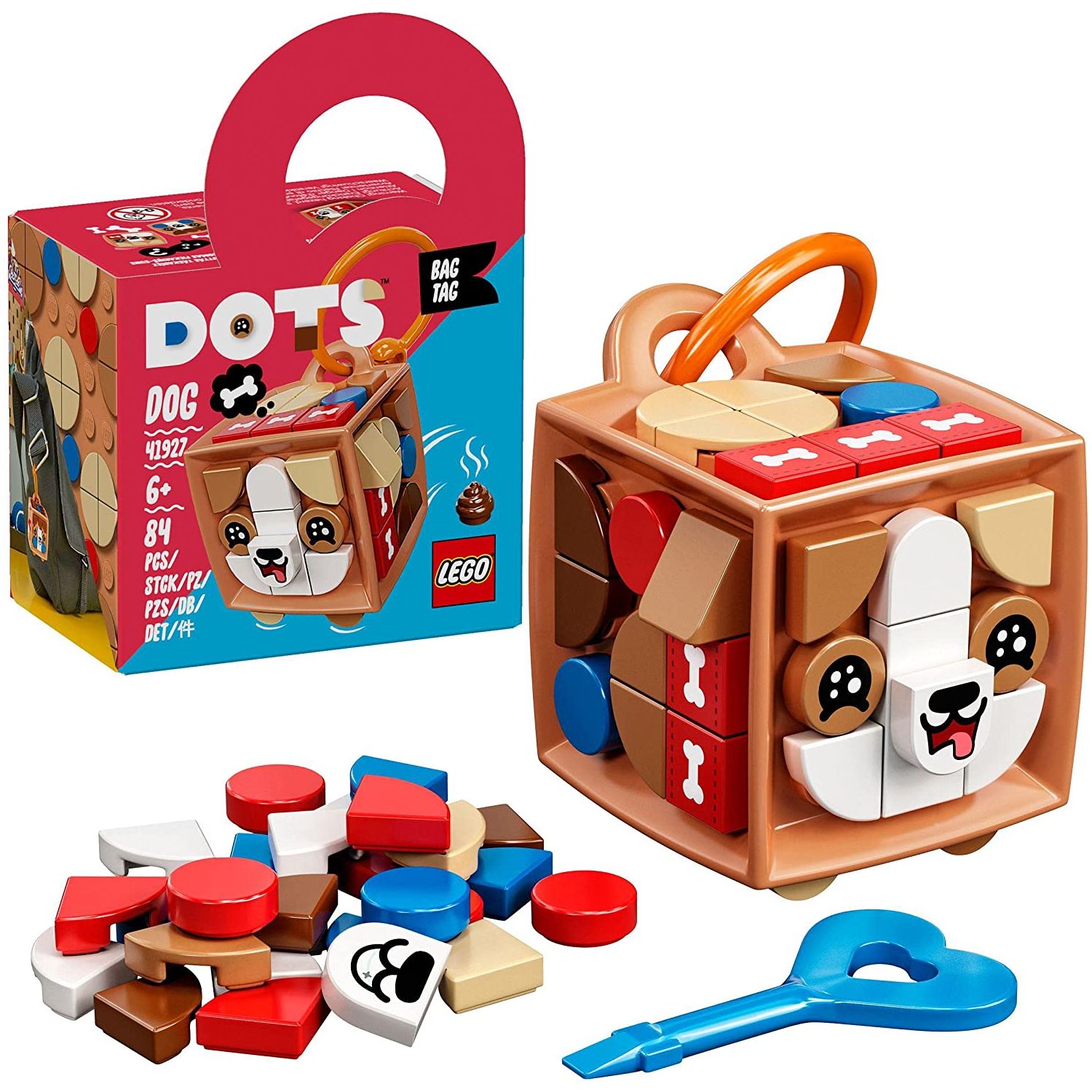 • Surprise any youngster with this cute animal LEGO® DOTS Bag Tag Dog (41927) kit, letting them craft a sturdy cube that comes with a silicone ring, key-shaped tile remover and plenty of colorful tiles.