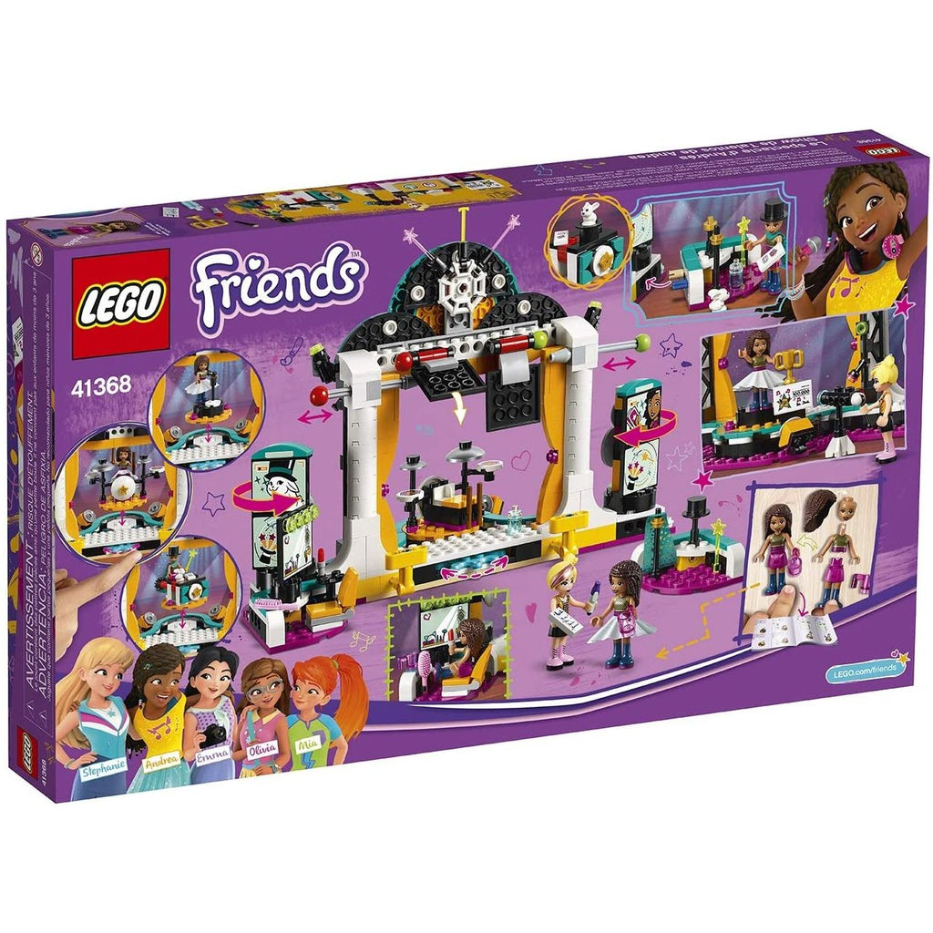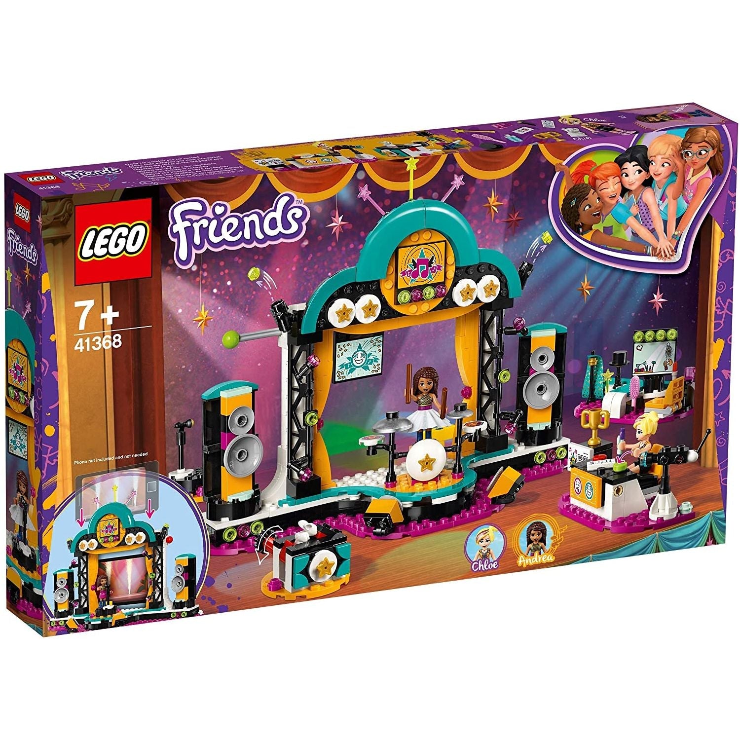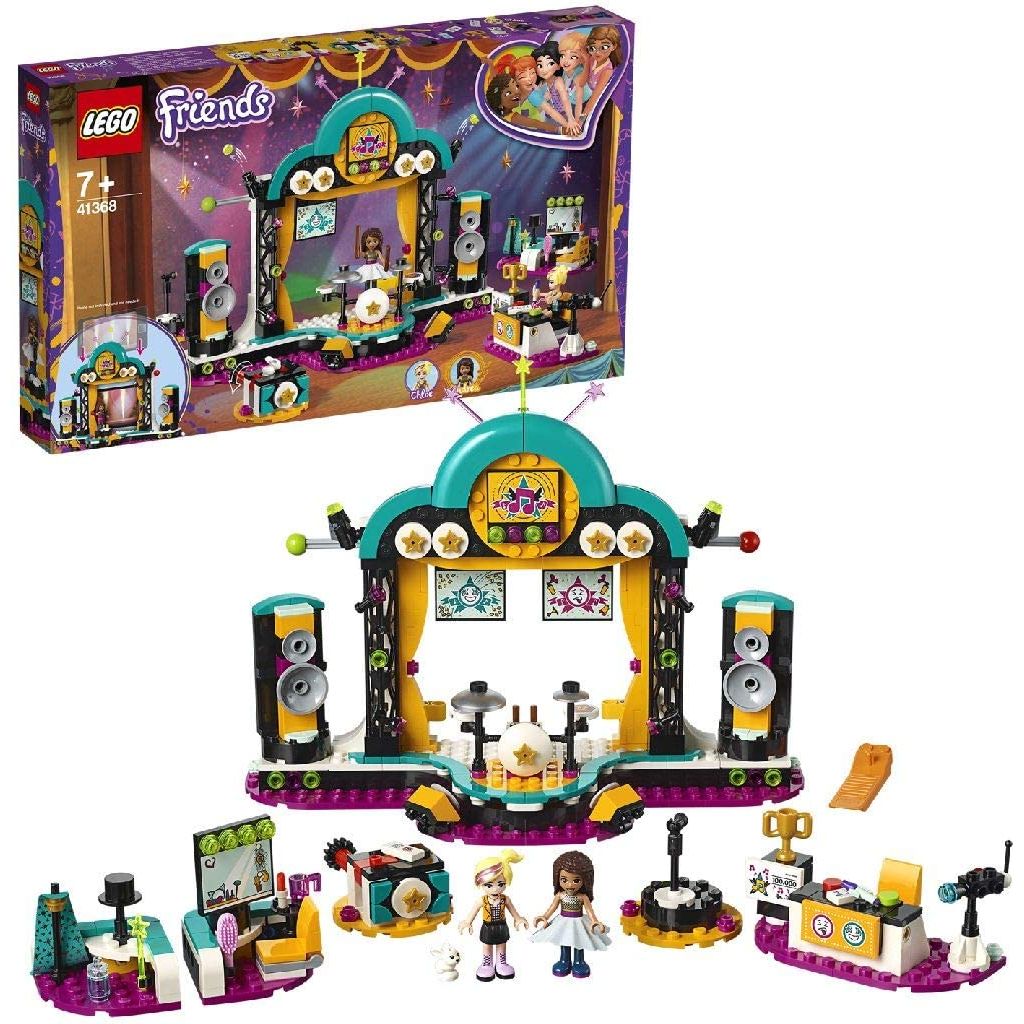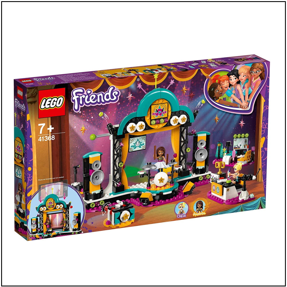 It’s showtime with LEGO® Friends 41368 Andrea’s Talent Show. This set features 3 different rotating stage sets for hours of creative play displaying Andrea’s talents. Get her ready in the dressing room, then on stage, help her sing, play drums or perform magic—twist the knob on the clever box to make a bunny appear! The 2 speakers at the side of the stage rotate to reveal big screens. Enhance the play further by placing your cell phone on the stand and playing a video or music to provide a backdrop for Andrea—2 yellow clips behind the stage secure the device. Help Chloe use the red and green buttons on the judge’s desk to say what she thinks of the talent show acts, and make the flags drop down above the stage to reveal her reaction. Then use the firework functions to celebrate the results of the LEGO talent show. Includes 2 mini-doll figures: Andrea and Chloe, plus a rabbit figure.