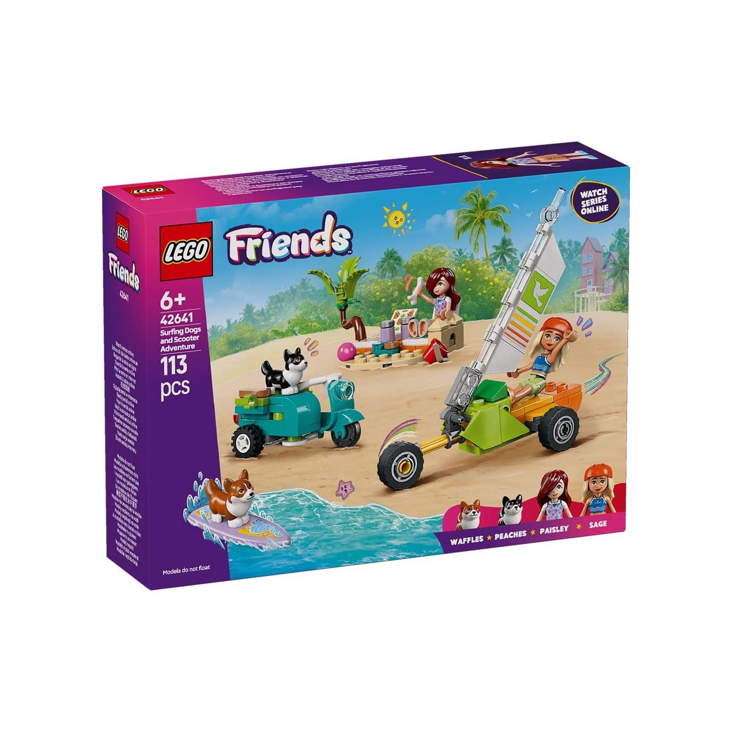 Join the story as Sage and Paisley take their pet corgis to the beach for a day of fun. The friends relax on the lounge chairs while the pups take turns riding the surfboard. Then it’s time to take a spin in the scooter or land yacht, where there’s space for a dog to ride too!