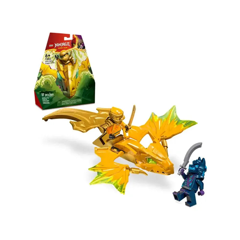 - Ninja action toy – Kids can place Rising Dragon Arin on the back of the yellow dragon toy, slam down its golden tail and launch them both into the air