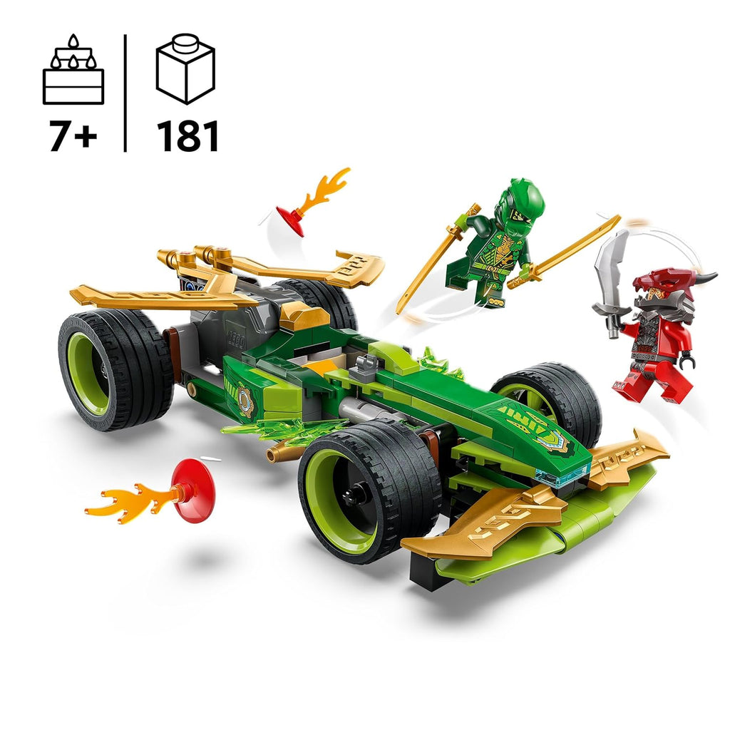 The pretend play building kit comes with 2 NINJAGO minifigures: Lloyd with 2 golden katana sword accessories, and a villainous Dragonian Warrior with a sword accessory for kids to role-play exciting battles. The building set also includes 2 lighting elements to create a small obstacle course for the race car.
