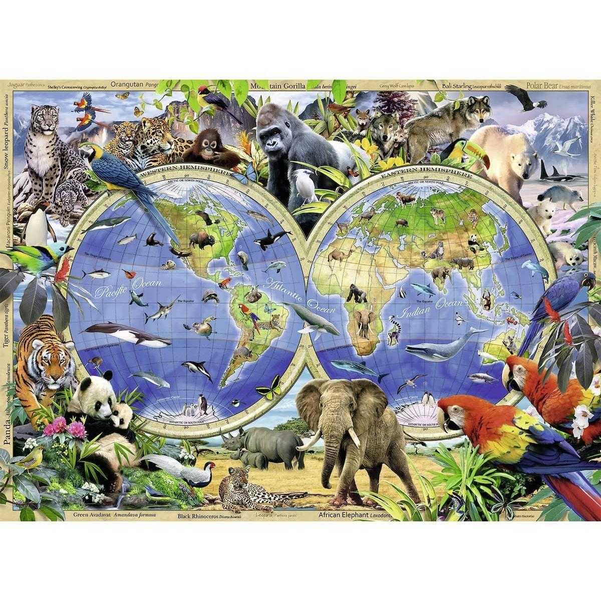 This is a stunning modern interpretation of the richly illustrated world maps of old. Created especially for Ravensburger by leading wildlife artist Howard Robinson, the design depicts some of the world's rarest and most endangered species. Puzzlers will find plenty to discover and enjoy in this remarkably colourful jigsaw puzzle. High quality 300 piece cardboard jigsaw puzzle with Extra Extra Large pieces. The finished puzzle measures 49 x 36 cm when complete. Suitable for ages 9 years and up. Made from strong premium grade cardboard, with linen finish print to minimise glare on puzzle image.