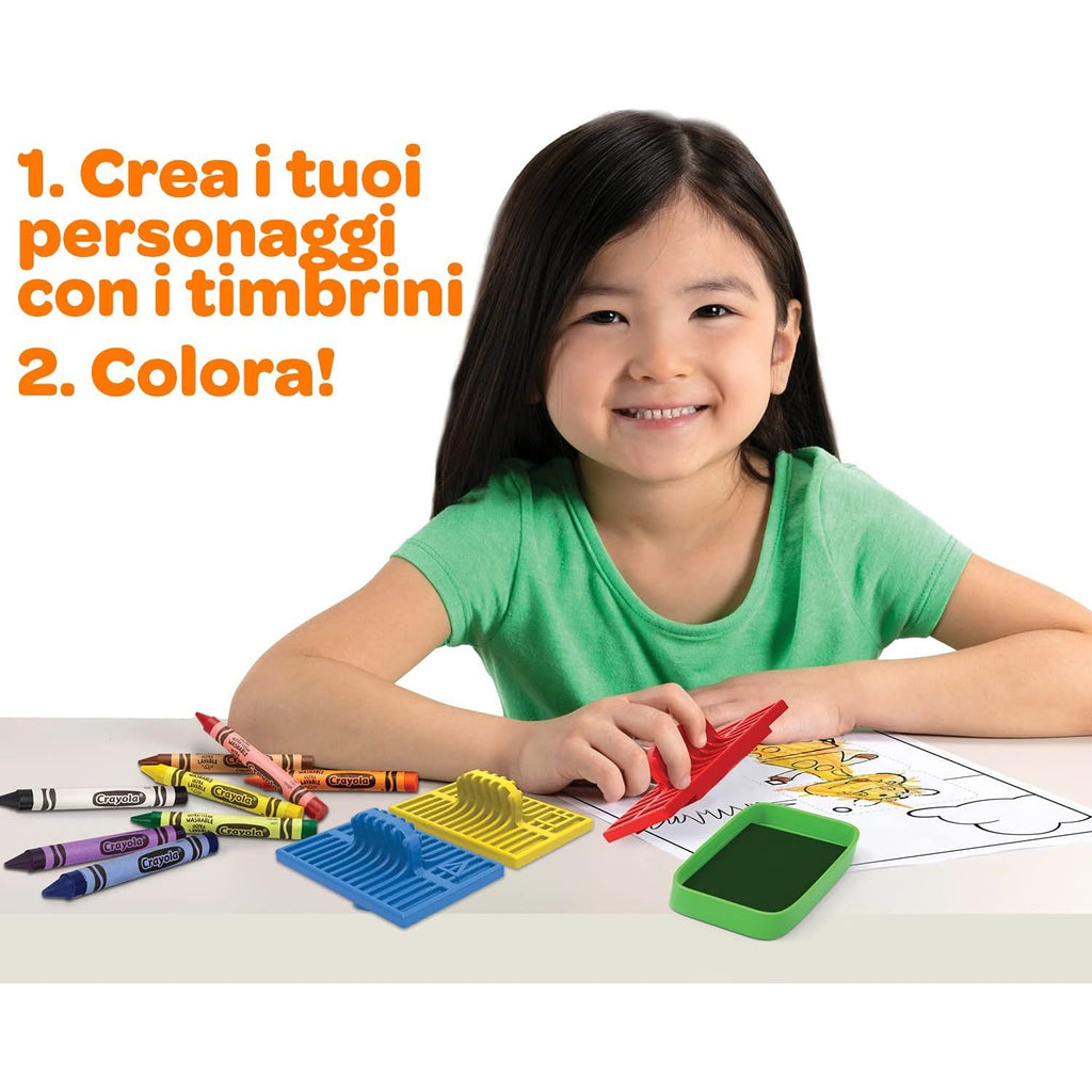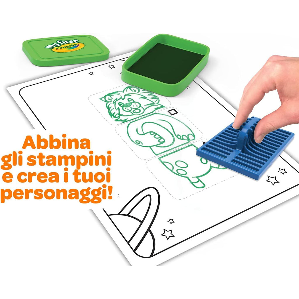 - CRAYOLA STAMPERS FOR KIDS: Features 9 animal stampers, 1 washable black ink pad, 8 washable crayons, and 24 coloring pages.