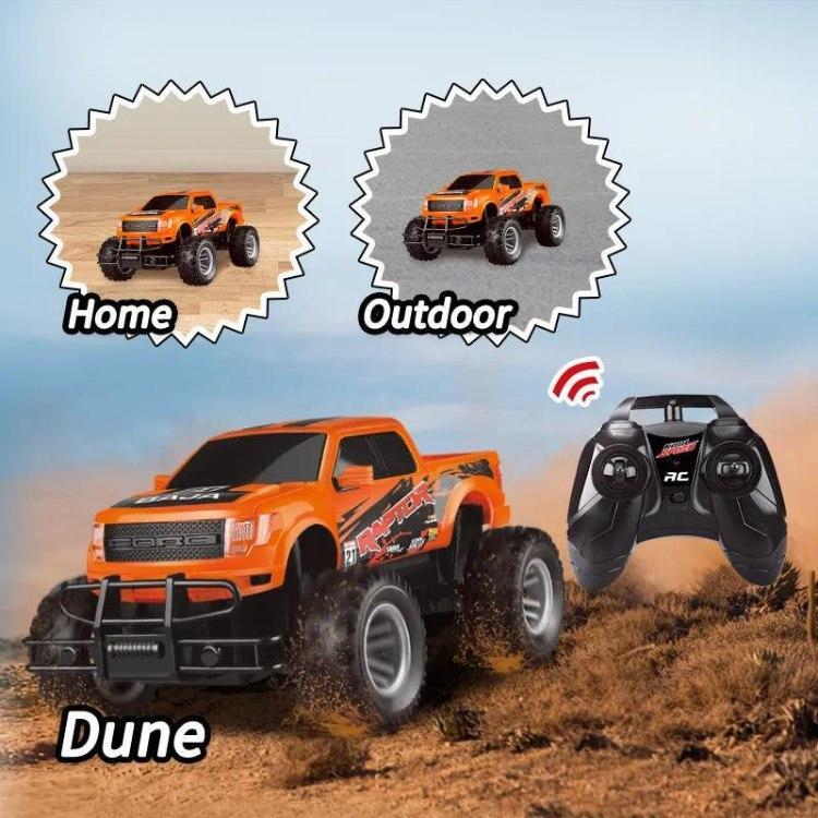 Remote-controlled Ford F150 Raptor 32cm toy car with officially licensed 1:18 scale design, working headlights, large wheels and full-function steering.