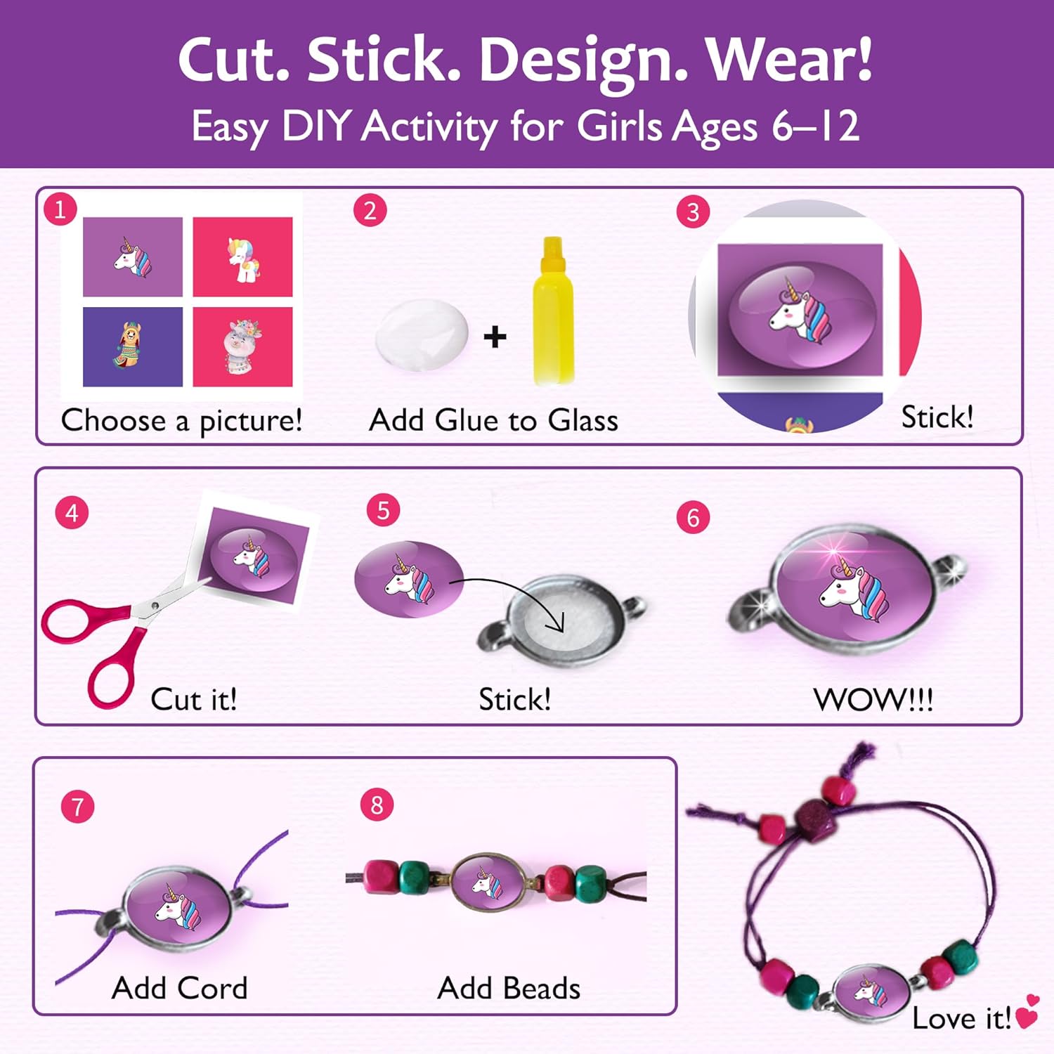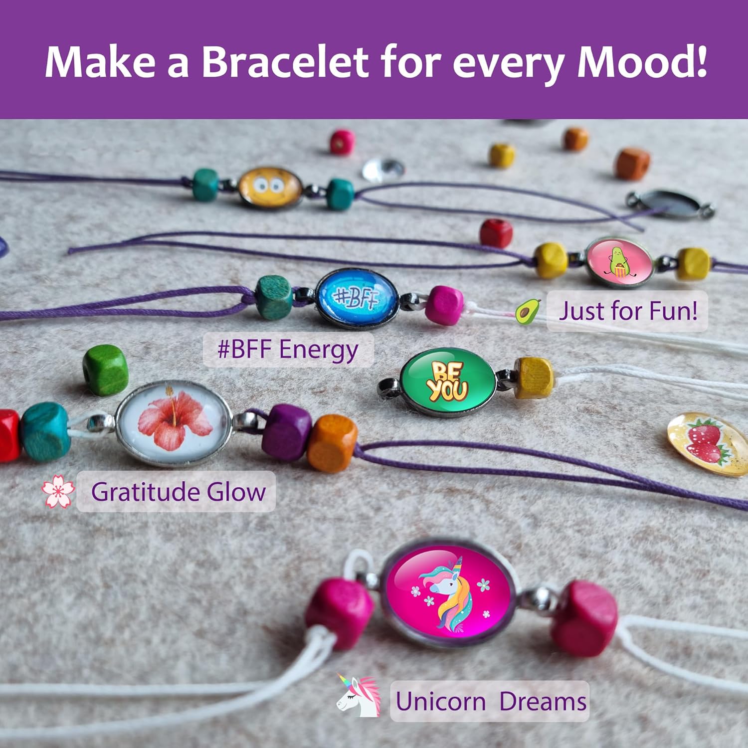 Our all-in-one DIY kit lets girls create 8 beautiful bracelets with premium wooden beads, metal trays, and glass domes—no flimsy plastic here.
