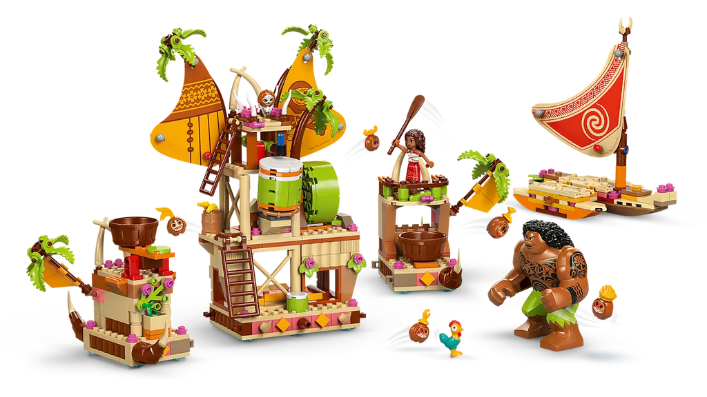 • Moana boat building set – Includes a barge boat with 3sections and a zipline, a smaller, 2-hulled canoe with storage space, Heihei the chicken, Moana, Maui, Kotu and 5 more LEGO® ǀ Disney characters