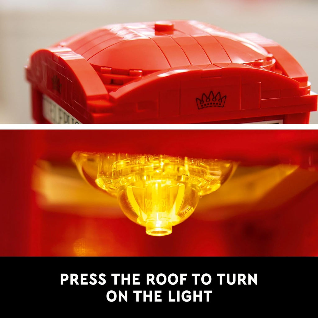 - Buildable decor for your home or office desk – Press the button on the roof of the booth to activate the LEGO® light brick inside, and use the fence as a cell phone stand