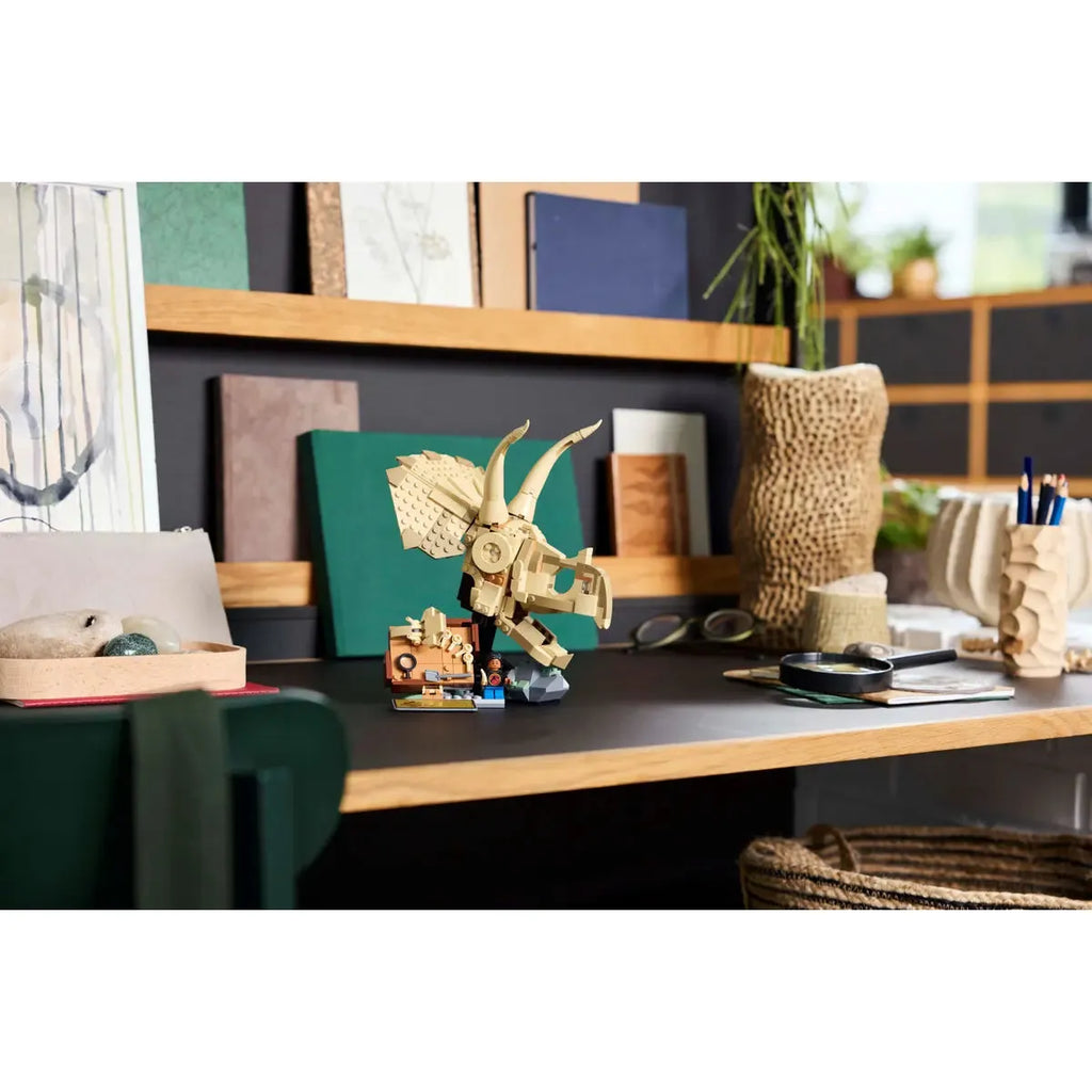 - Posable Triceratops skull with opening jaw – This kids’ toy skull can be posed open or closed, either on the stand or alongside the minifigure, dig site plate, mini-fossils and excavating tools