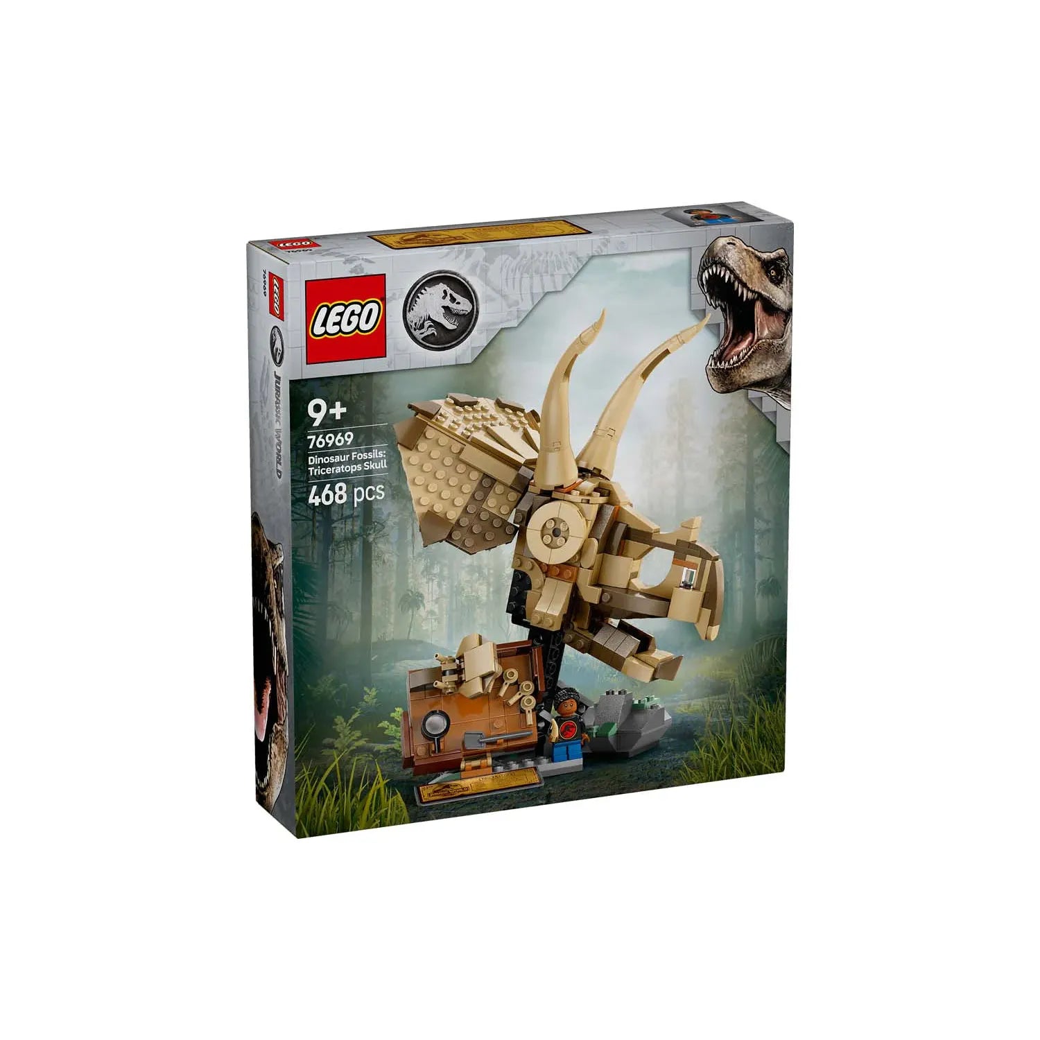 Young paleontologists aged 9 and up can enjoy imaginative Jurassic World play by collecting dinosaur fossils with this Dinosaur Fossils: Triceratops Skull (76969) LEGO® Jurassic World building kit. This model playset in the Dinosaur Fossils display series features a Triceratops skull with an opening jaw, a stand with a rock base, a dig site plate with mini-fossils and excavating tools, a LEGO minifigure, an information plaque and an ’amber’ piece with an encased mosquito.