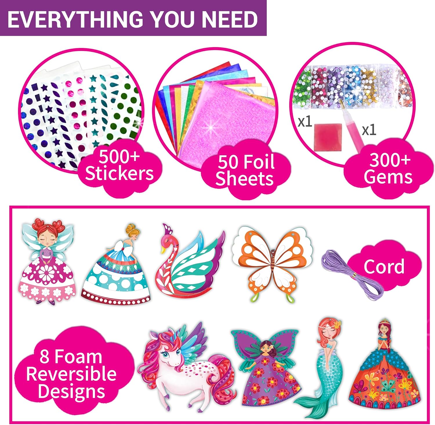 Unleash your child's inner sparkle with Sparkle & Shine! This 3-in-1 crafting bonanza lets them create dazzling masterpieces with Diamond Painting, Foil Art, and dazzling Sticker Activities. From magical unicorns and majestic princesses to playful fairies, shimmering mermaids, and fluttering butterflies, their imagination can take flight! It's easy and mess-free too, with pre-glued gems, peel-and-press foil, and shiny stickers. Parents will love the frustration-free fun, while kids develop creativity, imagination, fine motor skills, and confidence as they create and display their sparkling masterpieces!
